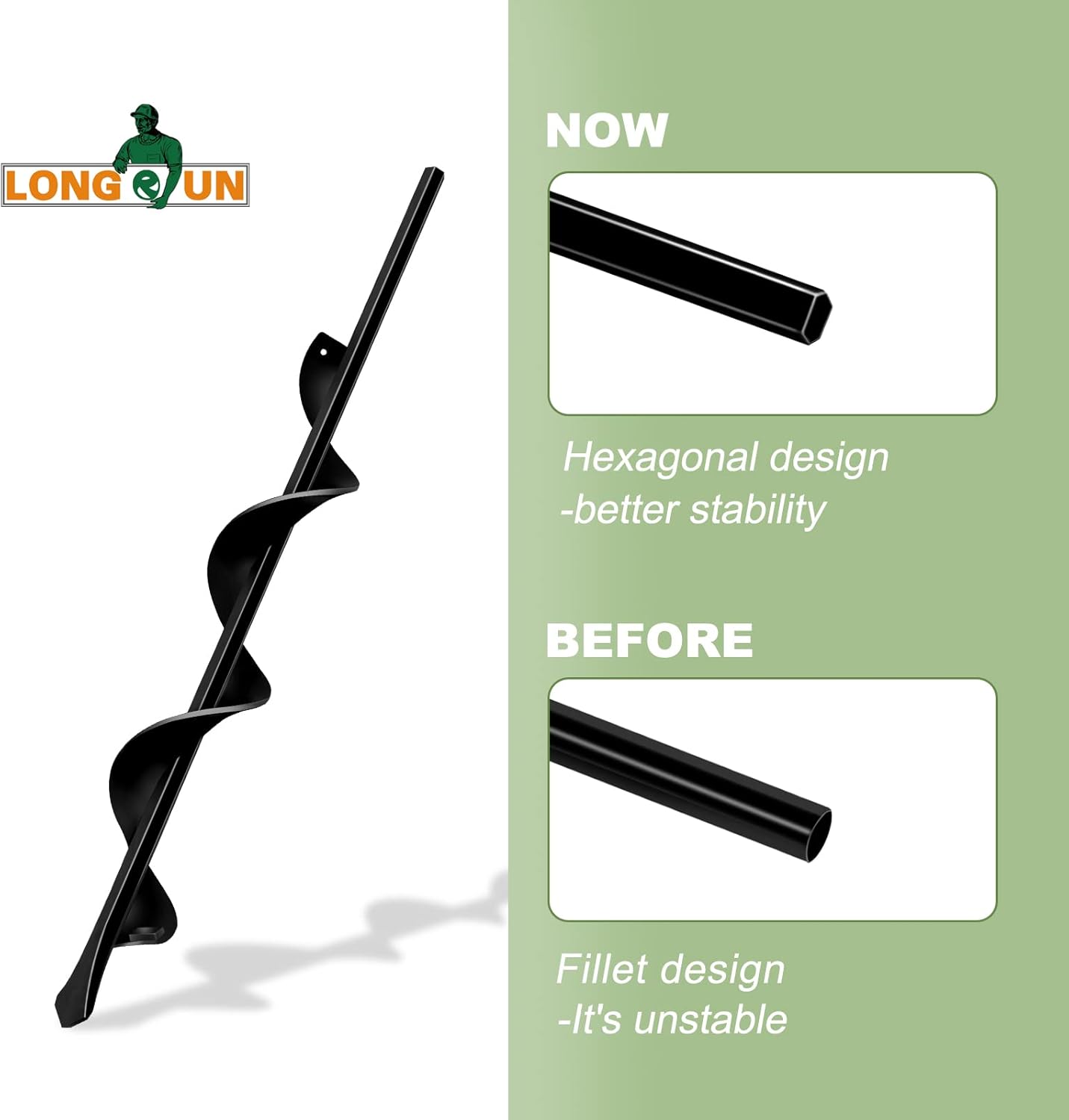- 【Alloy Steel Blade Design】LONGRUN’s garden auger bit comes with an alloy steel blade, which is the biggest difference from other products. It can impact some hard roots and some small rocks during use.