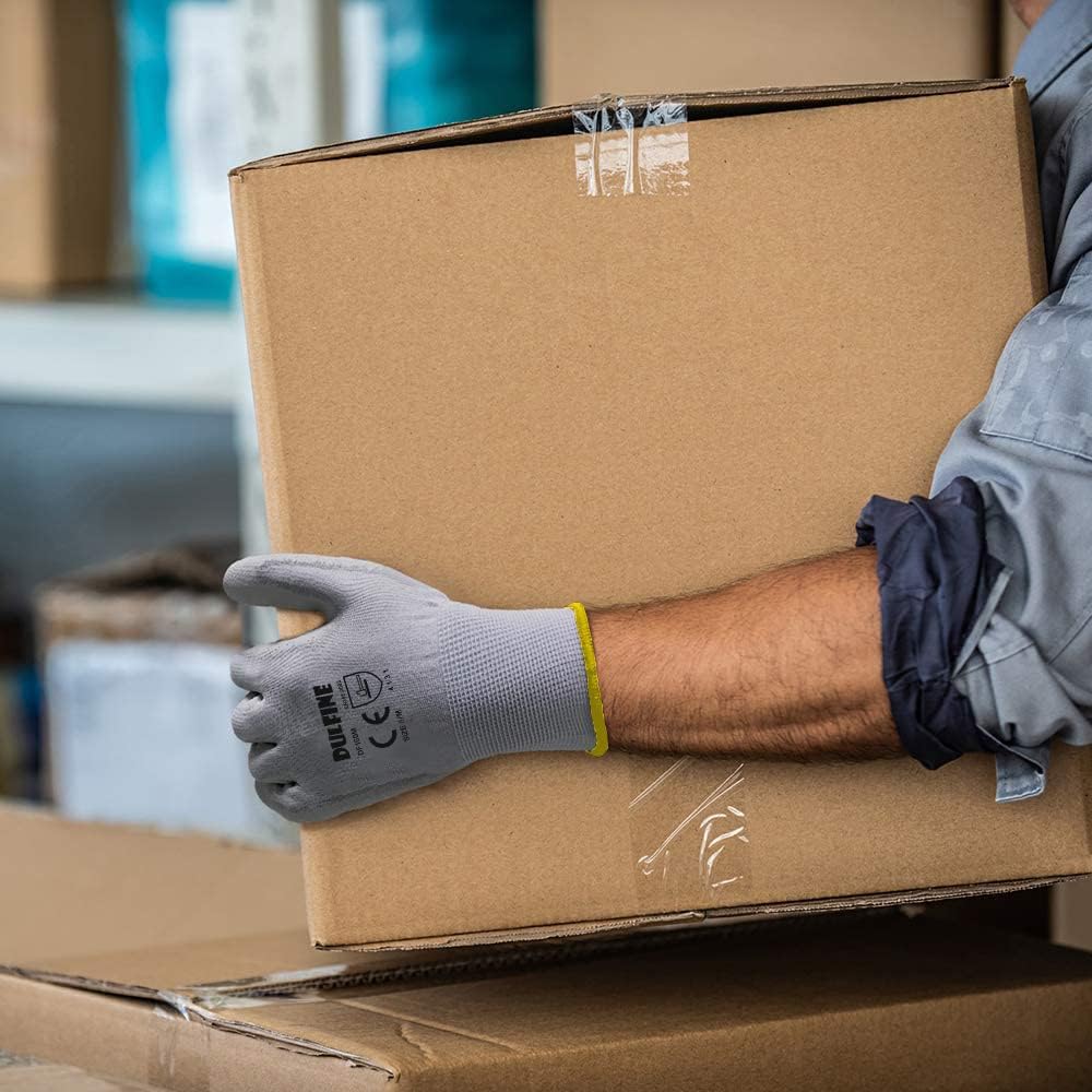 DULFINE Safety Work Gloves PU Coated-12 Pairs,Grey Seamless Knit Glove with Polyurethane Coated Smooth Grip on Palm & Fingers, for Men and Women, Ideal for General Duty Work (Large)