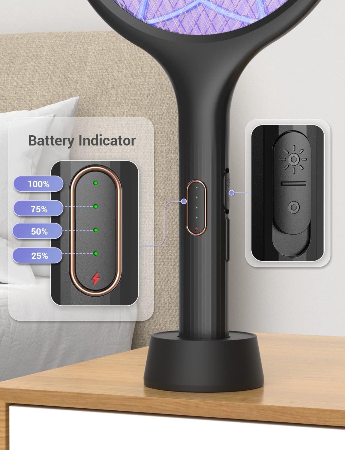 - (Convenient Auto Zap Mode Fly Zapper Racket) Turn YISSVIC mosquito swatter on, sit it on the stand. The bug light of electric fly swatter racket will attract the pests and fry them to a crisp