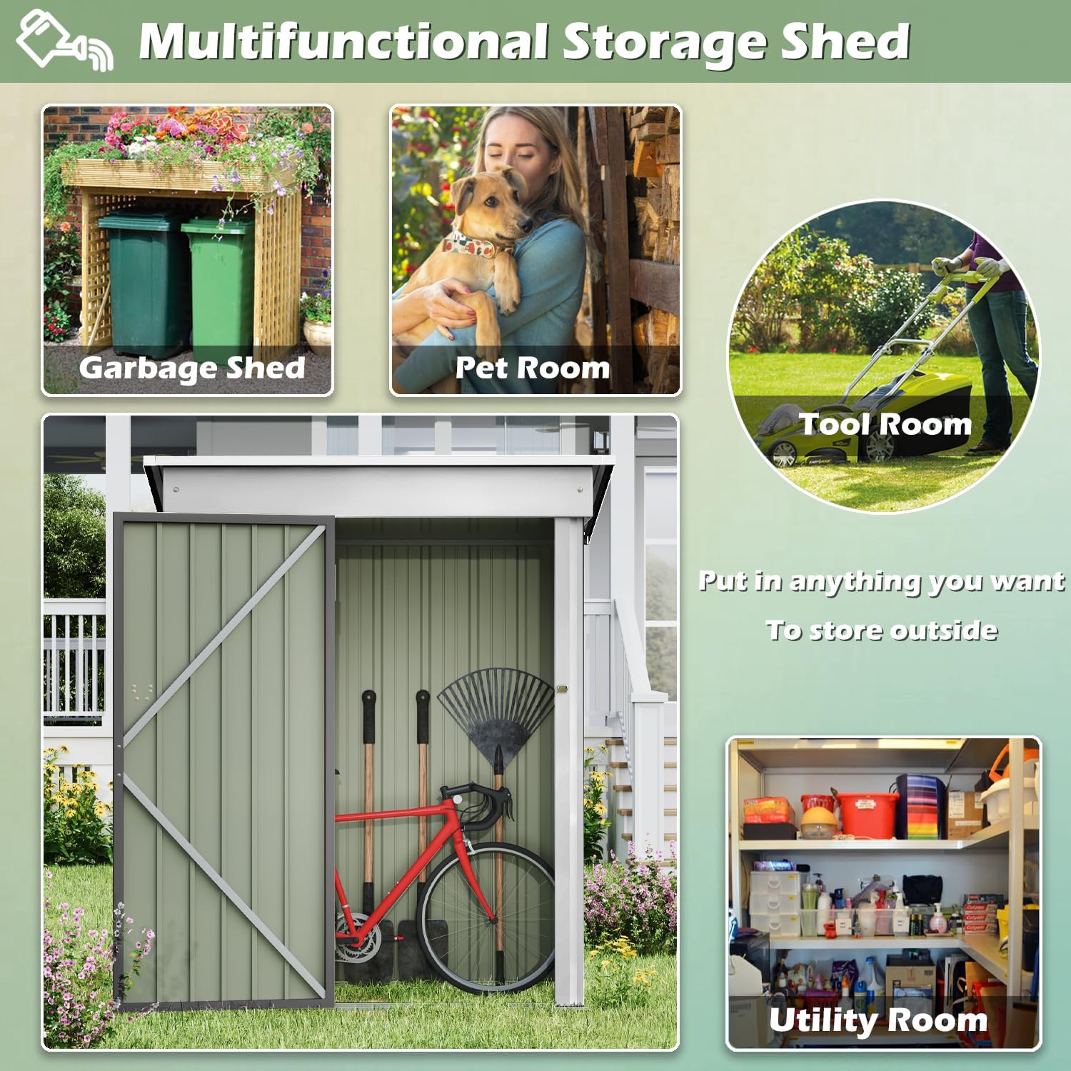 - [Garden Organizer] What you receive is not only a 5 x 3 ft (61 x 34.3 x 71 inches)metal garden storage shed, but an open and uncluttered garden. 67 cubic feet of storage to store garden tools like shovels, lawn mowers, ladders, or outdoor items like bikes, tents to keep your garden organized.