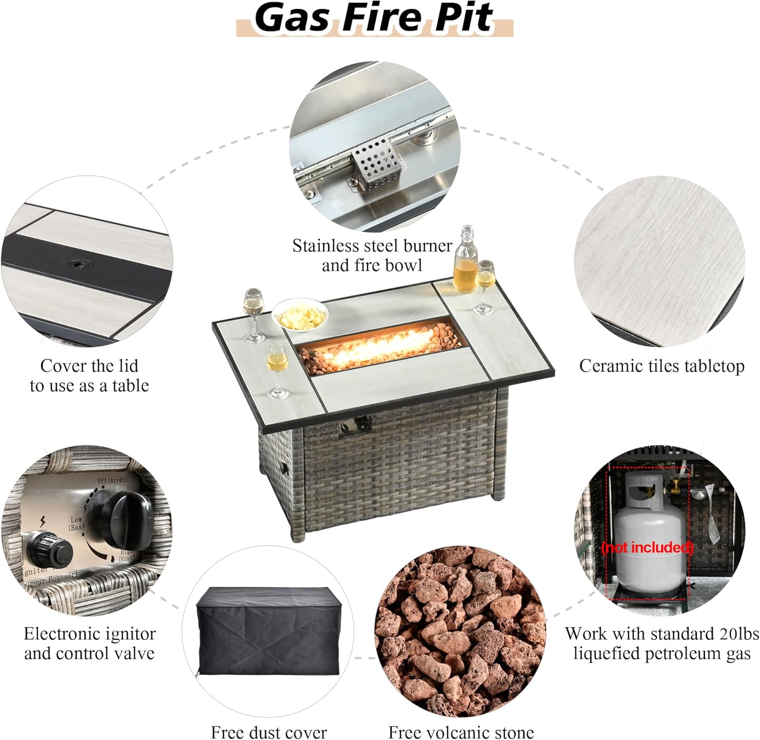 - FirePit Table Included: Comes with a square convertible propane gas fire pit table. Night time use it as a fire pit table to add atmosphere. Day time use it as a tall Dining table with the burner lid. Stainless Steel Burner withstands all weather. CSA certificated for safety.
