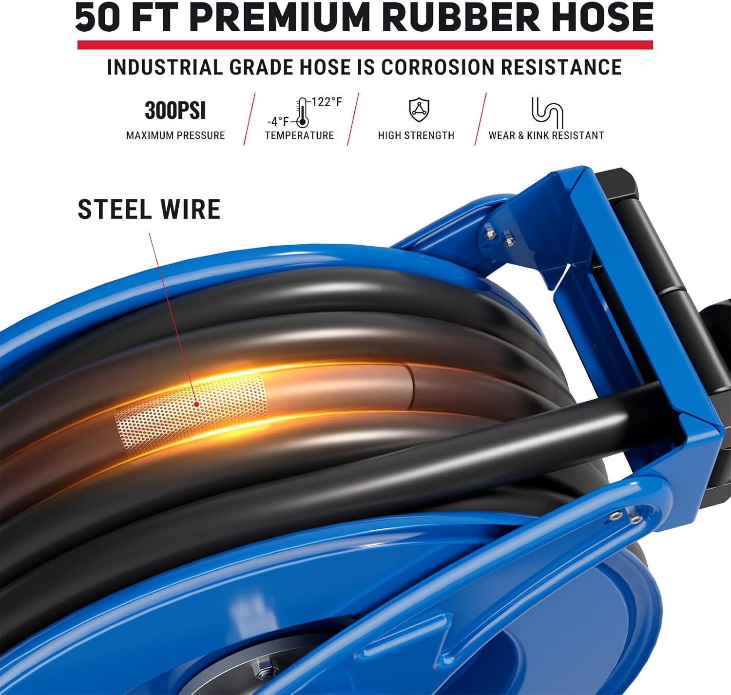 - Industrial-grade Rubber Hose: Fuel hose reel made from industrial-grade rubber that is strong, flexible, abrasion-, heat-, and ozone-resistant, and built to withstand the toughest conditions from-14℉ to 122℉. A 50 FT length of 3/4 inch diameter hose gives you extra working length. Plus, rated to 300 PSI maximum pressure, it's capable of delivering fast flow and precise volumes of fuel, diesel or kerosene, and more