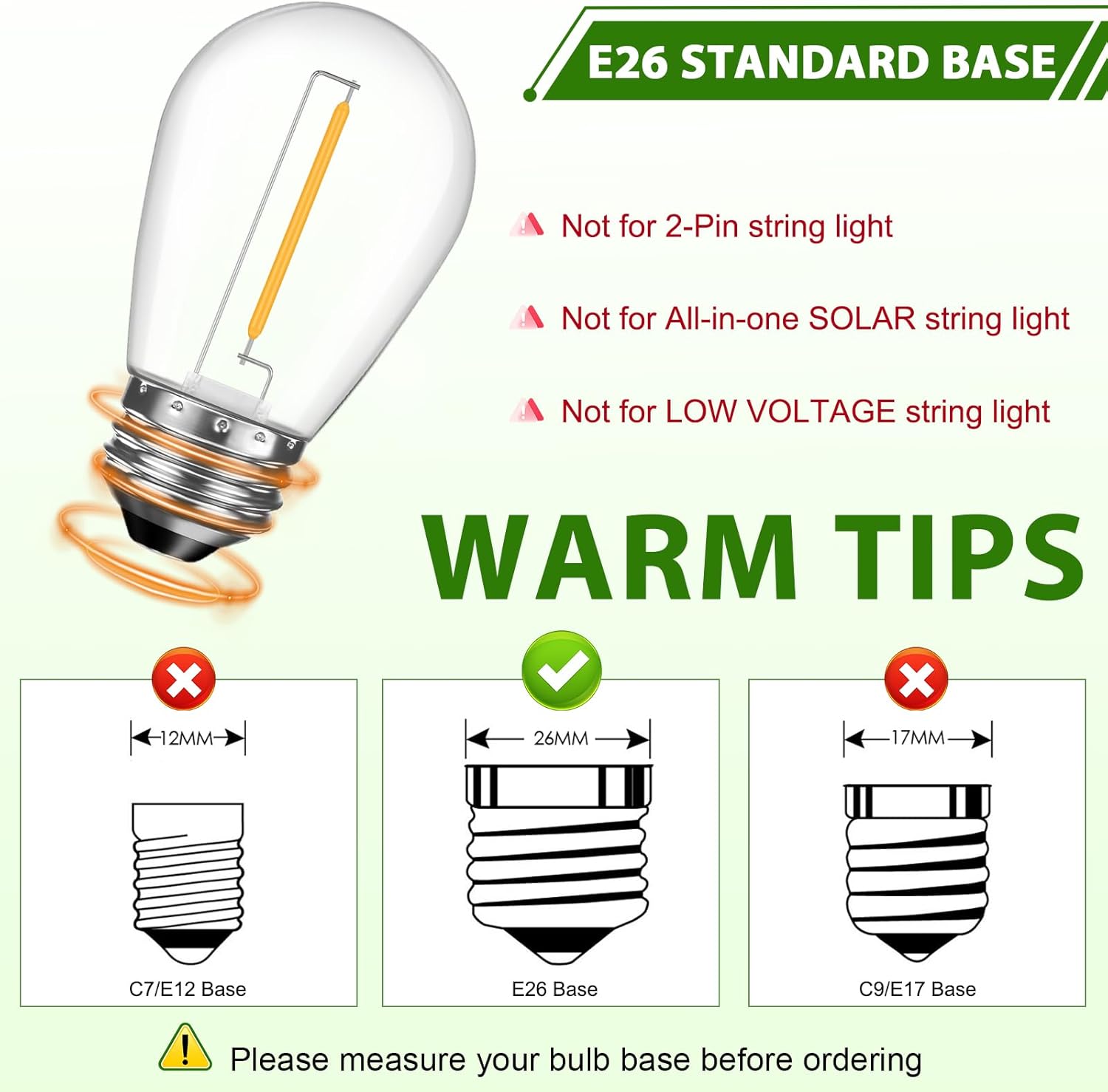 - 【Multi Application】GvvooHome outdoor light bulbs can be used as either outdoor string light bulbs or indoor bulb string lights, bistro lights bulbs, patio light bulbs. UL Listed outdoor decorative light, easy to install, you can install it outdoor or indoor as you like.
