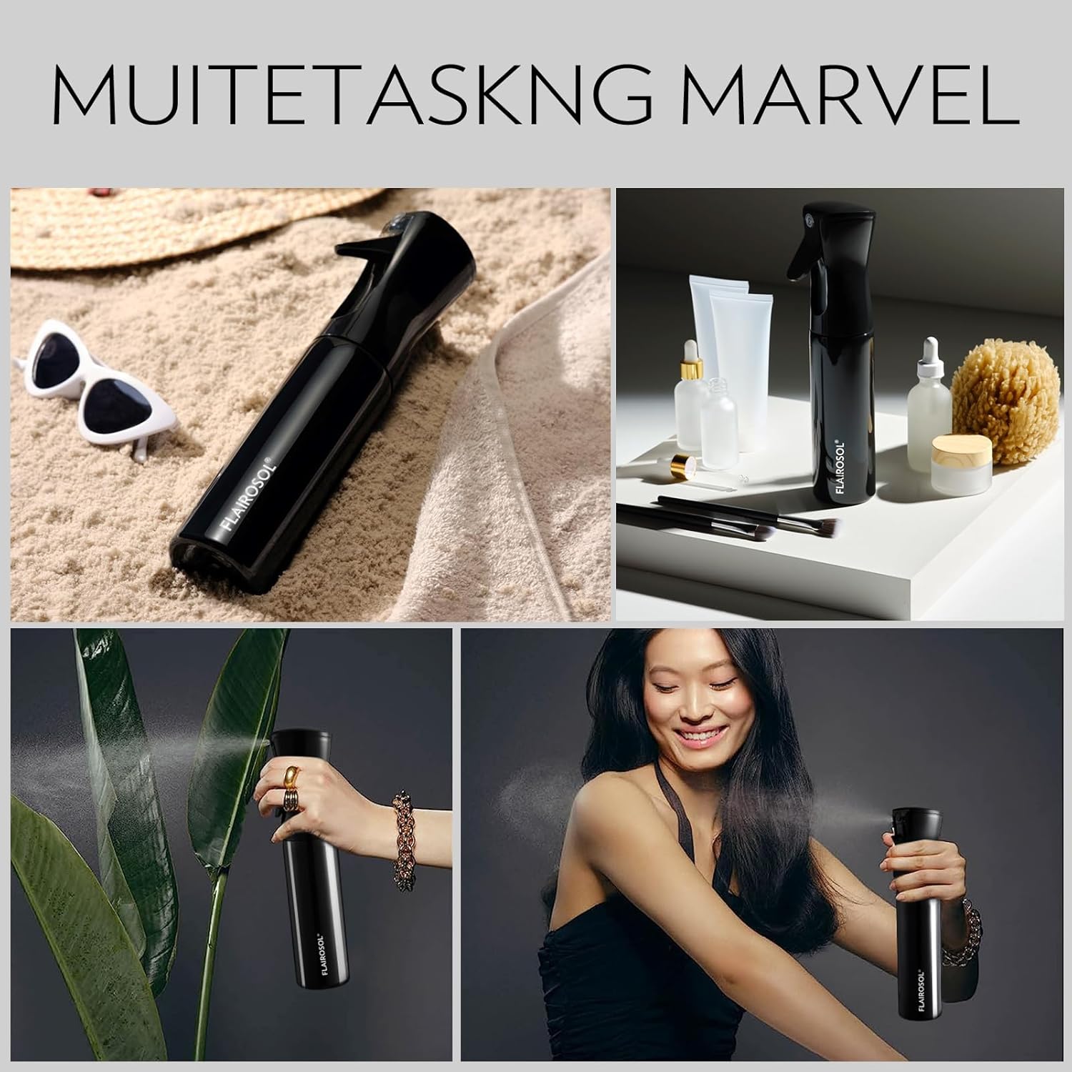 FLAIROSOL Spray Bottle for Hair, Continuous Spray Bottle with 0.3MM Ultra Fine Mist, Water Mister for Hairstyling, Cleaning, Plants, Pets, 10.1oz/300ml, Black Bottle, White Print