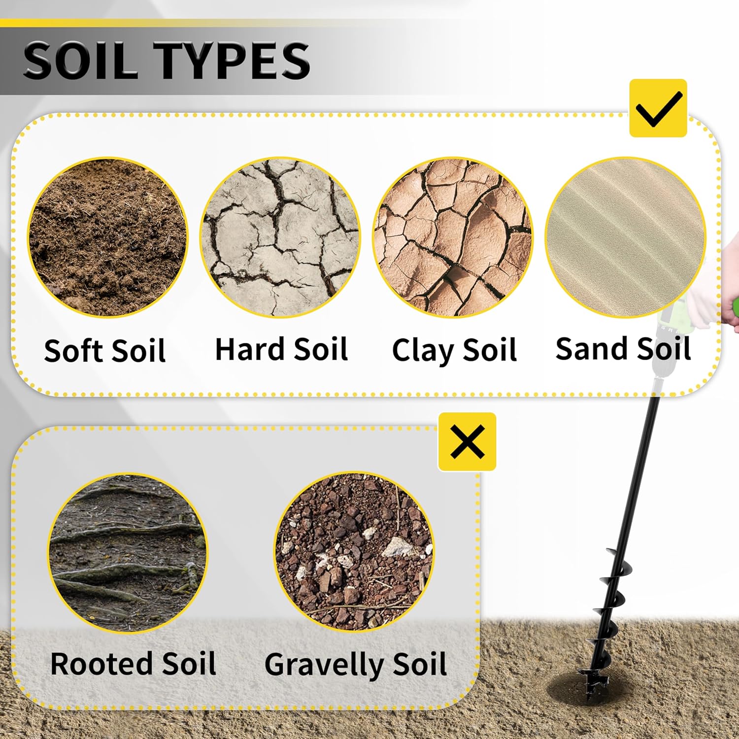 - 【Applicable Soil】Our auger drill bit for planting is ideal for use in sandy, loamy, and clay soils that are relatively soft. It excels in these types of soil, ensuring efficient and precise drilling. However, it is not recommended for soils with many rocks or dense root systems, as these can hinder its performance.