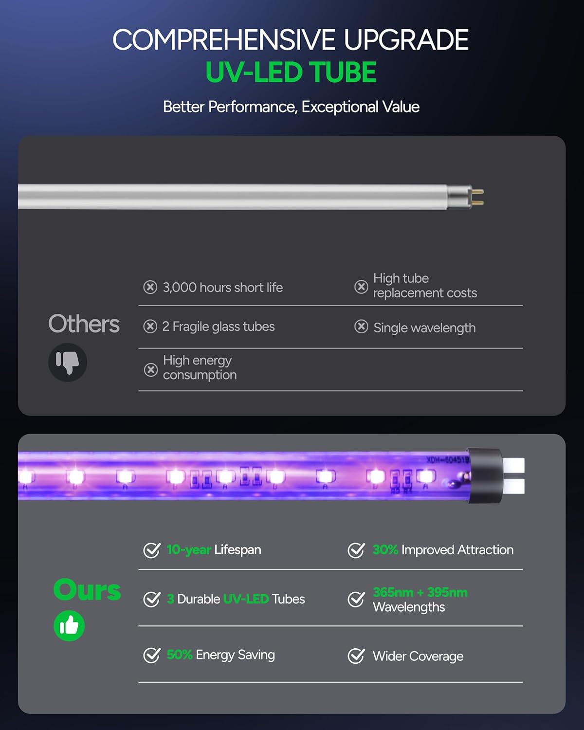- Energy-Efficient, Long-Lasting Performance:This mosquito trap is equipped with three 2W LED bulbs, reducing energy consumption by 40% compared to conventional bulbs. Each bulb has a lifespan of over 10 years, lasting up to 10 times longer than traditional glass bulbs. The bulbs are replaceable, offering long-term savings on energy and maintenance.are replaceable).